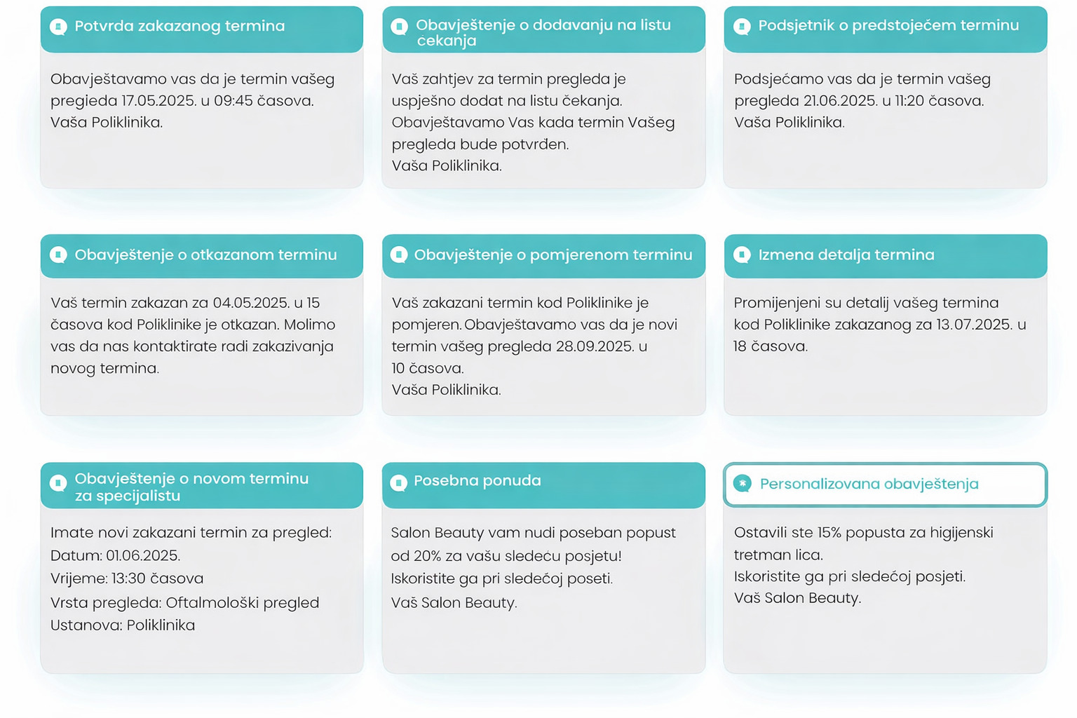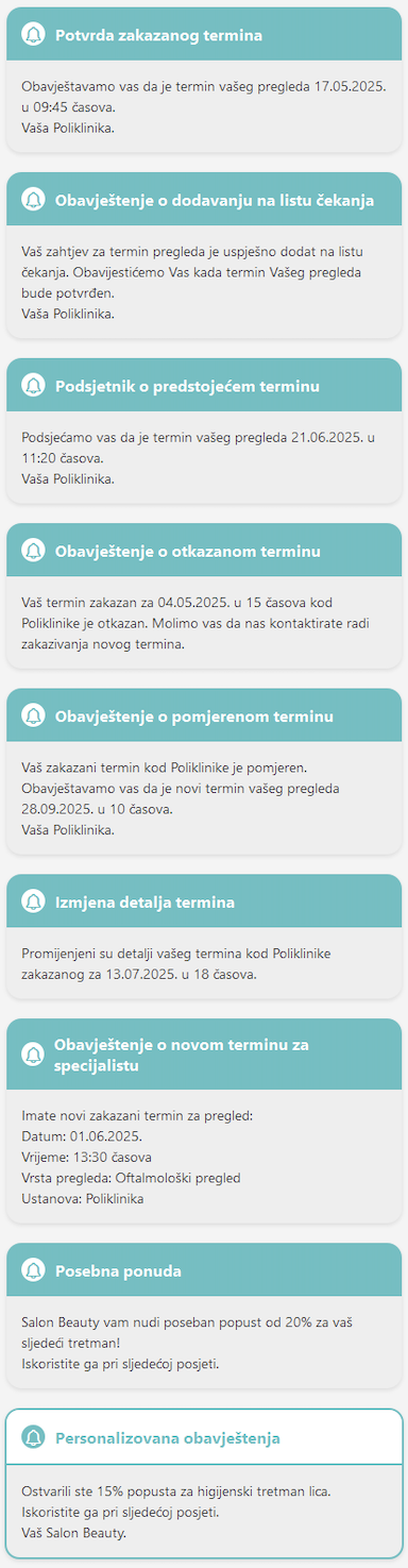 Prilagodite sadržaj poruka prema vašim potrebama. Kreirajte šablone za različite tipove pregleda, odjeljenja ili specijalnosti.